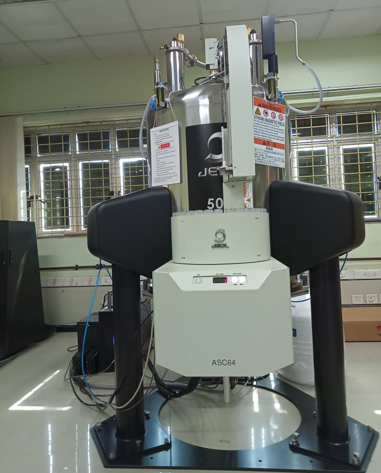 Major Specifications: Jeol JNM-60090 R5S1 is a two channel spectrometer. The frequency range from 10 MHz to 535 MHz. Room Temperature Shim, High Band amplifier (1H/19F): 100 W and low band (or Broad) band amplifier: 300 W, Gradient strength: 30 G/Cm @ 10 A. Superconducting Magnet 500/54 JJWS with central field 11.74 Tesla. Auto Tuning Unit Z. 64 vials Auto sampler unit along with 64 spinners.